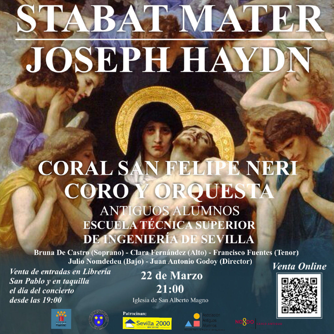 Te invitamos a disfrutar de una noche mágica con la Coral San Felipe Neri y nuestro Coro y Orquesta de Cámara de la Asociación de Antiguos Alumnos de la Escuela Técnica Superior de Ingeniería de Sevilla. El próximo sábado 22 de marzo a las 21h, en la hermosa iglesia de San Alberto de Sevilla, podrás deleitarte con el conmovedor 𝕾𝖙𝖆𝖇𝖆𝖙 𝕸𝖆𝖙𝖊𝖗 (1767) de 𝐅.𝐉. 𝐇𝐚𝐲𝐝𝐧.